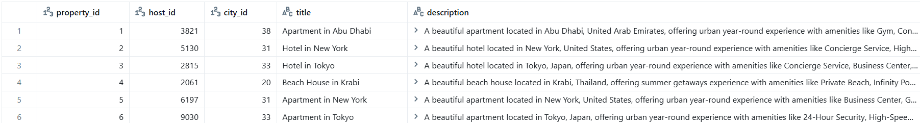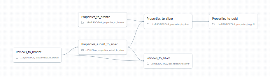 In this example, we filter out properties that have very few reviews (since we can’t extract much insight from them) and map property descriptions to embeddings – all of this is done in Databricks notebooks using standard Python, PySpark, orchestrated via a Databricks job.