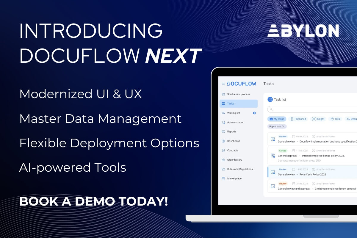 Docuflow, Abylon’s workflow automation platform, has reached a new level. Docuflow Next supports even faster, more transparent, and more controlled execution of document-based business processes with a modernized interface, new features, and AI-powered modules.