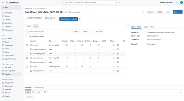 As mentioned before, we’re comparing two solutions to ingest data from Salesforce. Lakeflow Connect uses two Salesforce APIs in the background to load data. Depending on the data size, it’s either using the Salesforce REST API v63 or the Salesforce Bulk API 2.0.