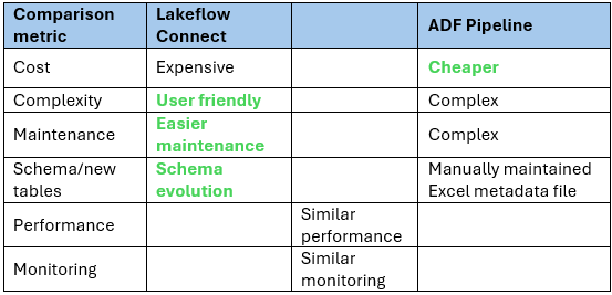 Performance-wise, the two solutions show similar performance, but with no restrictions, Lakeflow Connect can be faster than the ADF solution. Of course, we can create a larger Integration Runtime in ADF to reduce runtime. On average, the Lakeflow pipeline took 10-20 minutes to update all tables, while the ADF pipeline 20-30 minutes for the same tables.