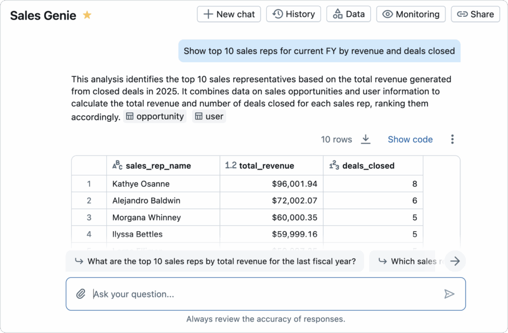 5. Szervezeti tudás integrációja – a Genie space metaadatai biztosítják, hogy a rendszer a vállalati kontextushoz igazodjon.