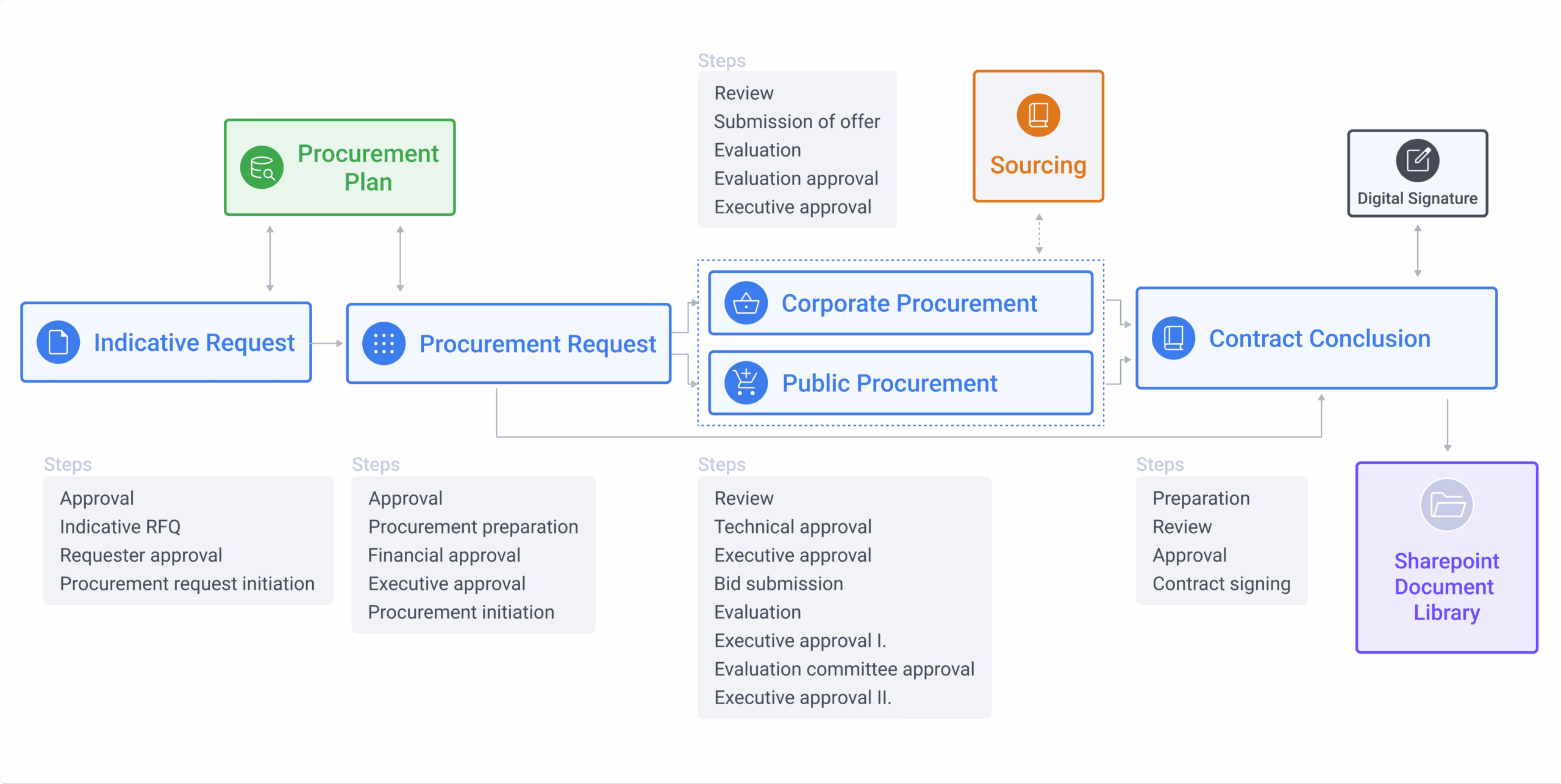 All procurement documents (requests for quotation, offers, evaluations, decision records, contracts, etc.) are stored in one structured, version-controlled place. Collaboration between legal, finance, and business teams becomes easier.